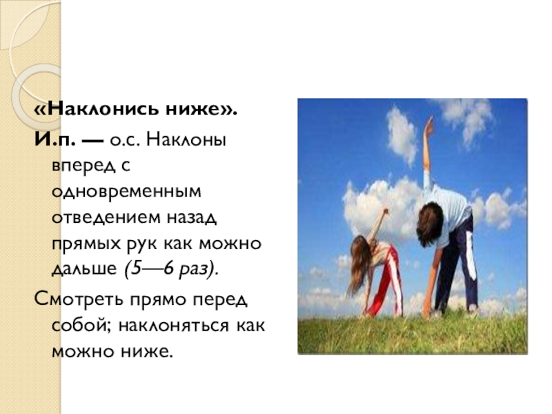 И.п. — о.с. Наклоны вперед с одновременным отведением назад прямых рук