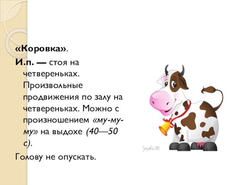 И.п. — стоя на четвереньках. Произвольные продвижения по залу на четвереньках. Можно