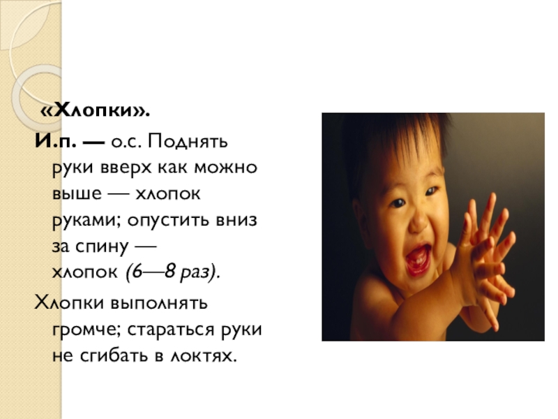 Хлопки выполнять громче; стараться руки не сгибать в локтях.