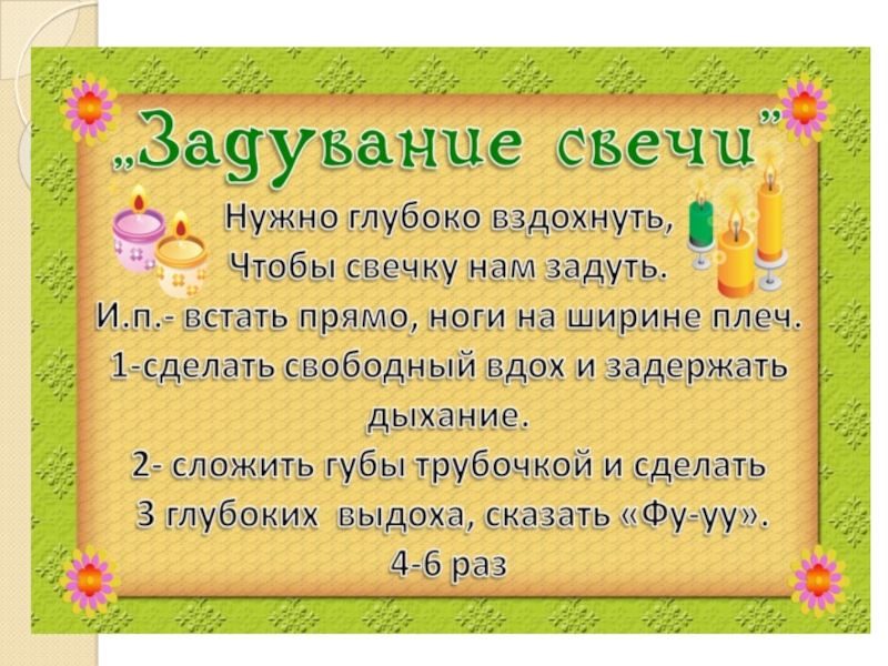 Делайте шумные, ритмичные, короткие вдохи носом и одновременно сжимаете ладони в кулаки (хватательные движения). Подряд сделайте 4 резких, ритмичных вдоха носом (т.е. «шмыгните» 4 раза). Затем руки опустите и отдохните 3-4 секунды –пауза.