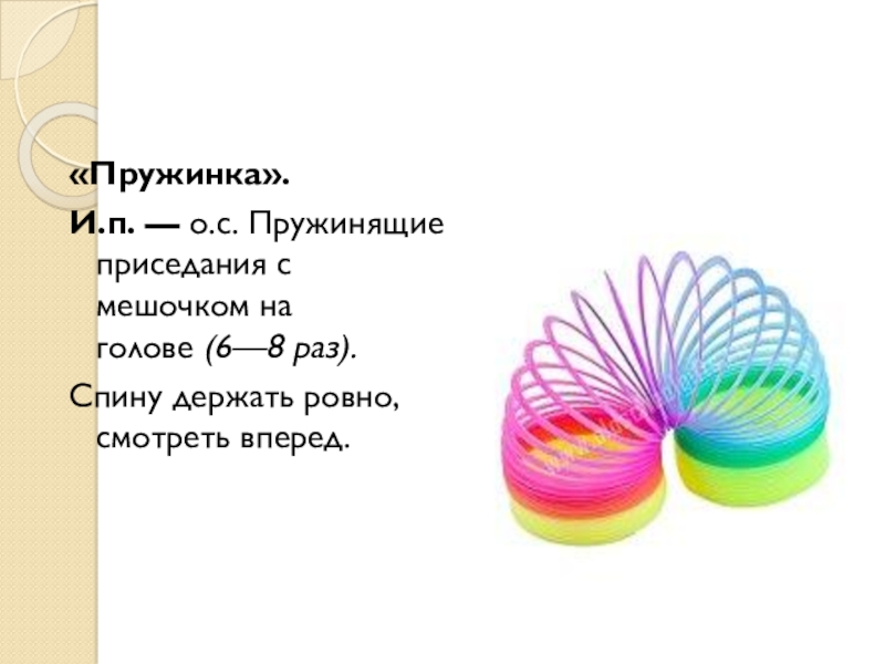 И.п. — о.с. Пружинящие приседания с мешочком на голове (6—8 раз).