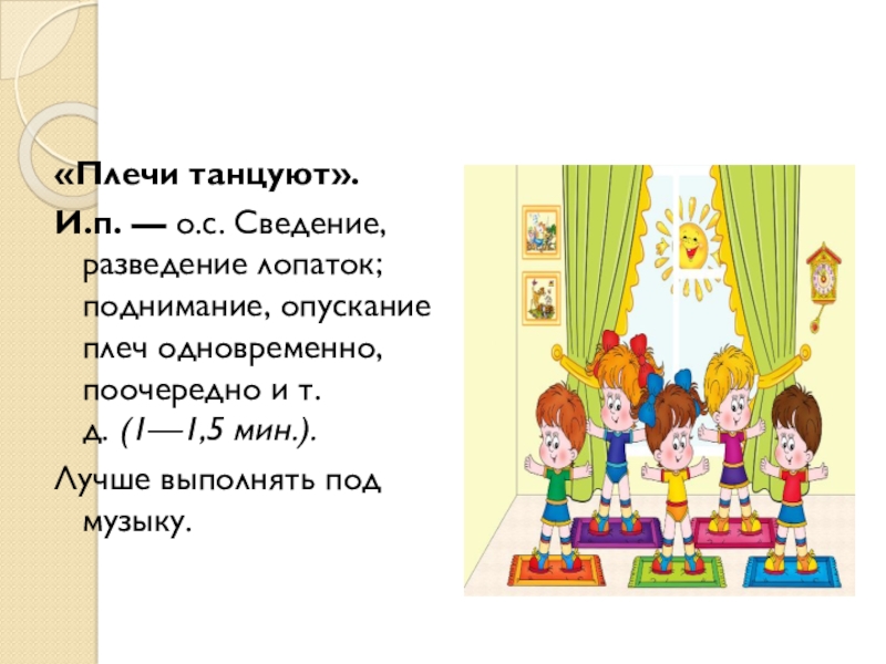 И.п. — о.с. Сведение, разведение лопаток; поднимание, опускание плеч одновременно, поочередно