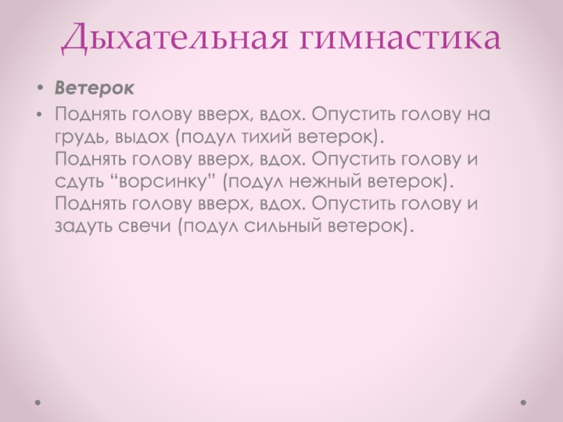 Дыхательная гимнастикаВетерокПоднять голову вверх, вдох. Опустить голову на грудь, выдох (подул тихий ветерок). Поднять голову вверх, вдох.