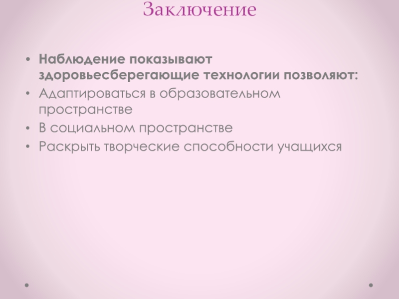 ЗаключениеНаблюдение показывают здоровьесберегающие технологии позволяют:Адаптироваться в образовательном пространствеВ социальном пространствеРаскрыть творческие способности учащихся