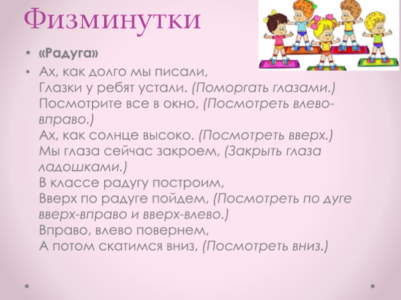 Физминутки«Радуга»Ах, как долго мы писали, Глазки у ребят устали. (Поморгать глазами.) Посмотрите все в окно, (Посмотреть влево-вправо.) Ах, как