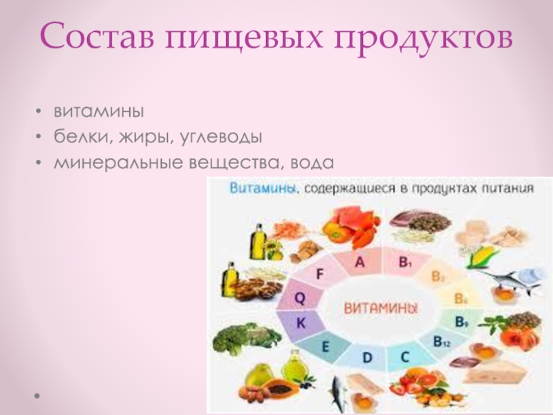 Состав пищевых продуктоввитаминыбелки, жиры, углеводыминеральные вещества, вода