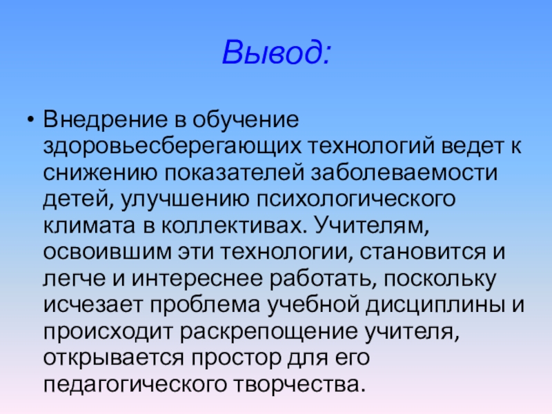улучшению психологического климата в коллективах. Учителям, освоившим эти технологии, становится и легче и интереснее работать, поскольку исчезает проблема учебной дисциплины и происходит раскрепощение учителя, открывается простор для его педагогического творчества.