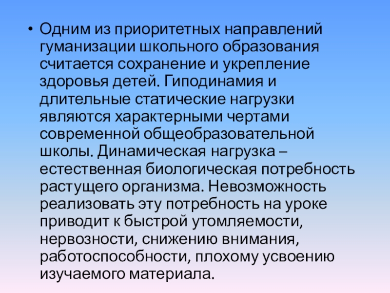 здоровья детей. Гиподинамия и длительные статические нагрузки являются характерными чертами современной общеобразовательной школы. Динамическая нагрузка – естественная биологическая потребность растущего организма. Невозможность реализовать эту потребность на уроке приводит к быстрой утомляемости, нервозности, снижению внимания, работоспособности, плохому усвоению изучаемого материала.