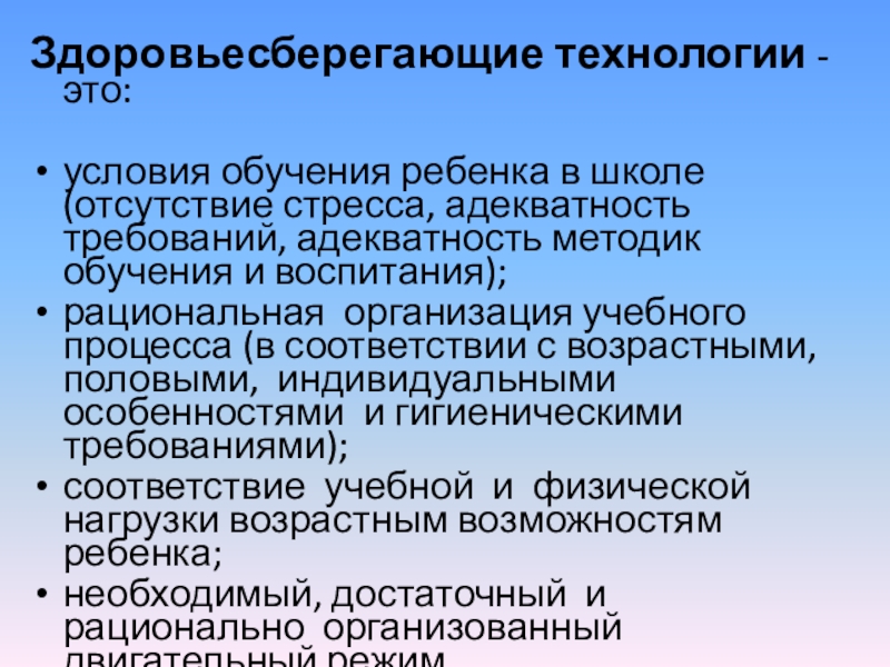 рациональная организация учебного процесса (в соответствии с возрастными, половыми, индивидуальными особенностями и гигиеническими требованиями);