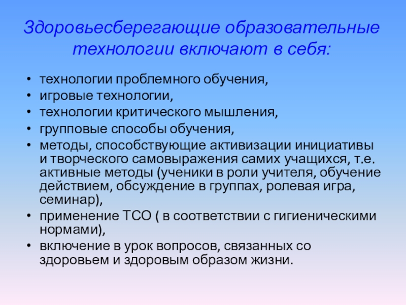 Слайд 6Здоровьесберегающие образовательные технологии включают в себя: