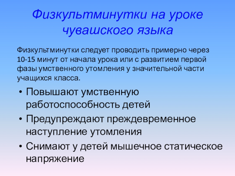 Физкультминутки следует проводить примерно через 10-15 минут от начала урока или с развитием первой фазы умственного утомления у значительной части учащихся класса.