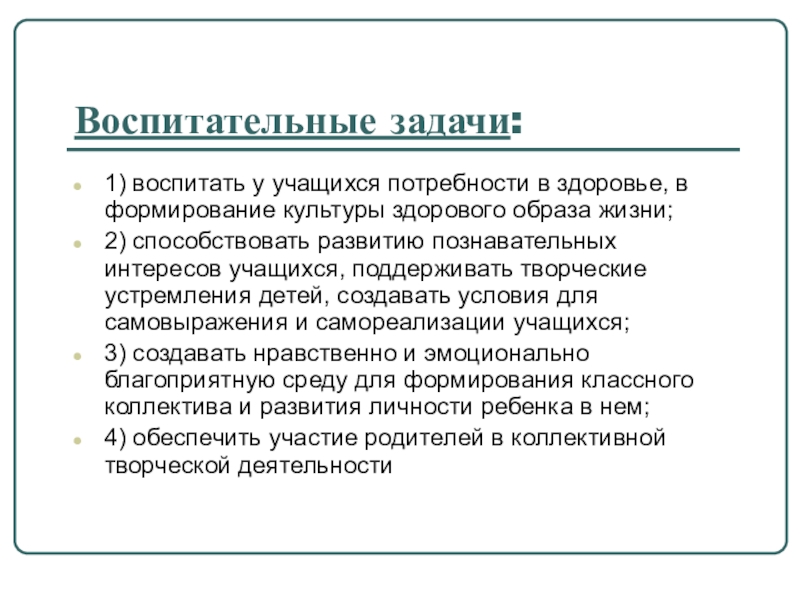 Воспитательные задачи: 1) воспитать у учащихся потребности в здоровье, в формирование культуры здорового образа жизни; 2) способствовать