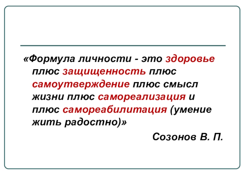 «Формула личности - это здоровье плюс защищенность плюс самоутверждение плюс смысл жизни плюс самореализация и плюс самореабилитация