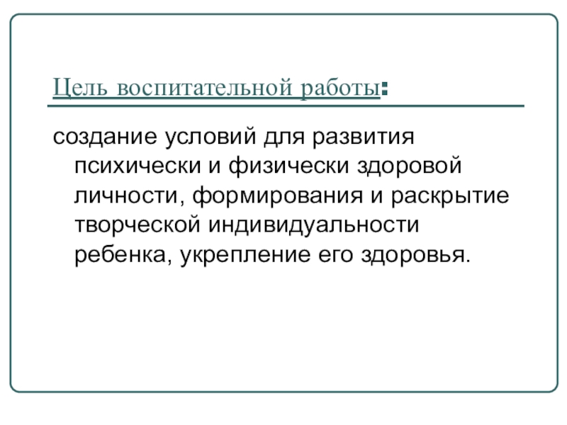 Цель воспитательной работы:создание условий для развития психически и физически здоровой личности, формирования и раскрытие творческой индивидуальности ребенка,