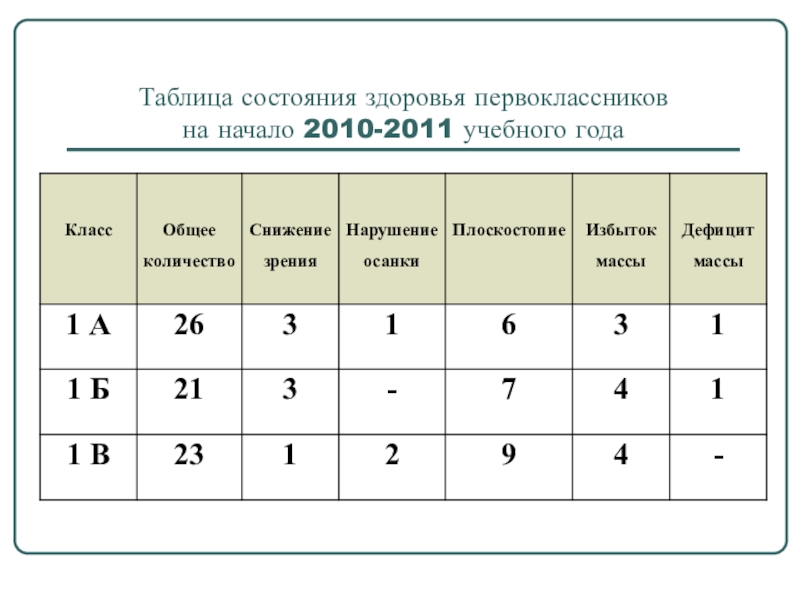 Слайд 3Таблица состояния здоровья первоклассников на начало 2010-2011 учебного года