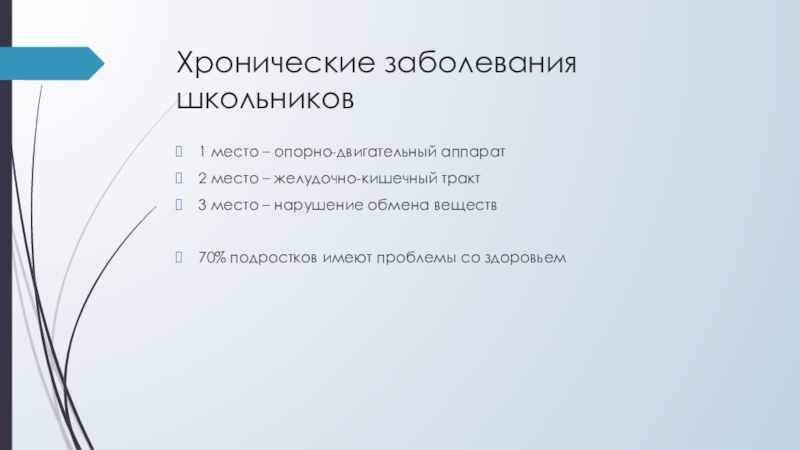 Хронические заболевания школьников1 место – опорно-двигательный аппарат2 место – желудочно-кишечный тракт3 место – нарушение обмена веществ70% подростков