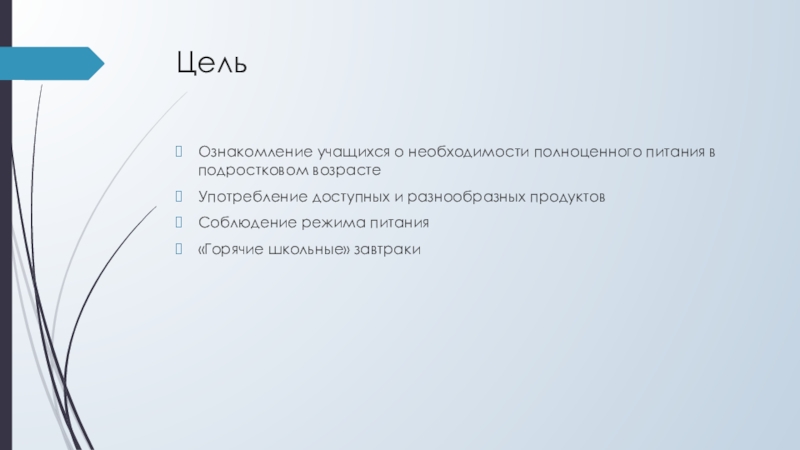 ЦельОзнакомление учащихся о необходимости полноценного питания в подростковом возрастеУпотребление доступных и разнообразных продуктовСоблюдение режима питания«Горячие школьные» завтраки