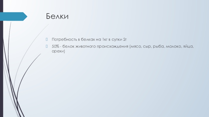 БелкиПотребность в белках на 1кг в сутки 2г50% - белок животного происхождения (мясо, сыр, рыба, молоко, яйца,