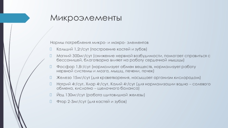 МикроэлементыНормы потребления микро- и макро- элементовКальций 1,2г/сут (построение костей и зубов)Магний 300мг/сут (снижение нервной возбудимости, помогает справиться