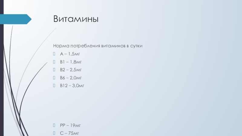 ВитаминыНорма потребления витаминов в суткиА – 1,5мгВ1 – 1,8мгВ2 – 2,5мгВ6 – 2,0мгВ12 – 3,0мгРР – 19мгС
