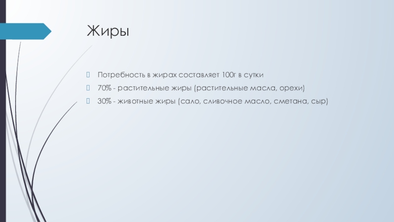 ЖирыПотребность в жирах составляет 100г в сутки70% - растительные жиры (растительные масла, орехи)30% - животные жиры (сало,