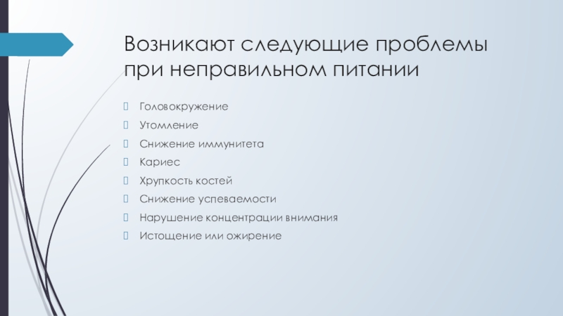 Возникают следующие проблемы при неправильном питанииГоловокружениеУтомлениеСнижение иммунитетаКариесХрупкость костейСнижение успеваемостиНарушение концентрации вниманияИстощение или ожирение