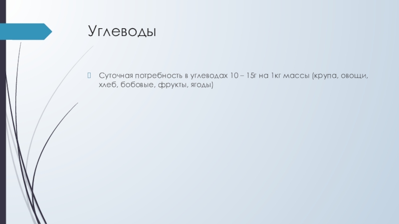УглеводыСуточная потребность в углеводах 10 – 15г на 1кг массы (крупа, овощи, хлеб, бобовые, фрукты, ягоды)