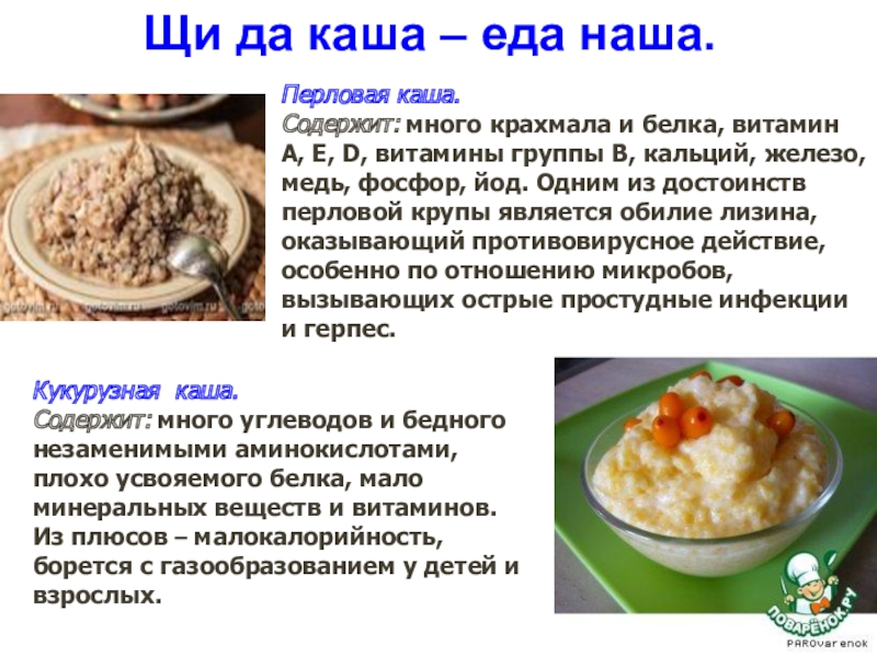 Содержит: много углеводов и бедного незаменимыми аминокислотами, плохо усвояемого белка, мало минеральных веществ и витаминов. Из плюсов – малокалорийность, борется с газообразованием у детей и взрослых.