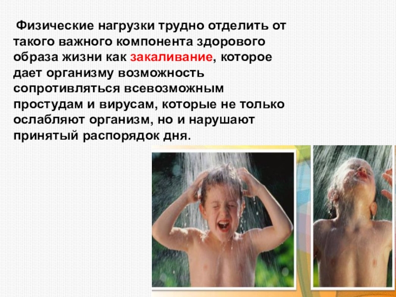 жизни как закаливание, которое дает организму возможность сопротивляться всевозможным простудам и вирусам, которые не только ослабляют организм, но и нарушают принятый распорядок дня.