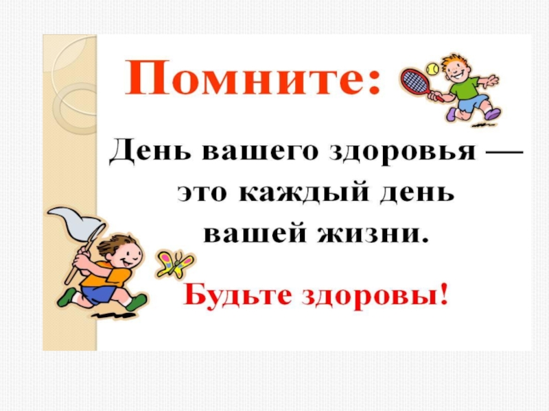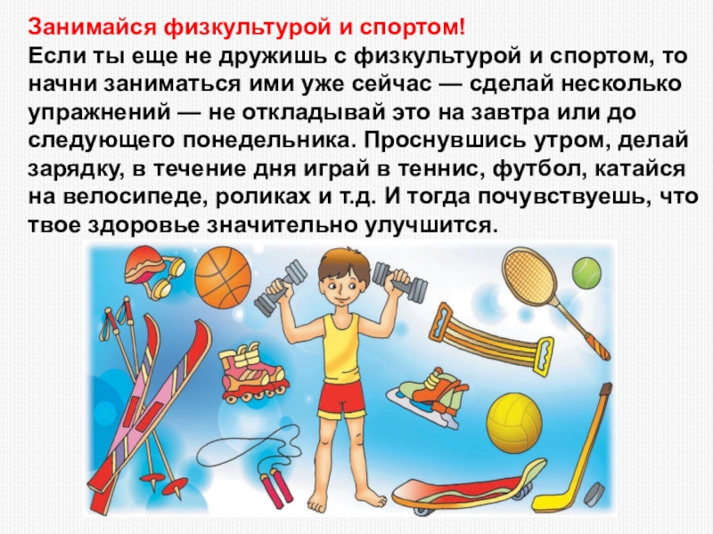 Если ты еще не дружишь с физкультурой и спортом, то начни заниматься ими уже сейчас — сделай несколько упражнений — не откладывай это на завтра или до следующего понедельника. Проснувшись утром, делай зарядку, в течение дня играй в теннис, футбол, катайся на велосипеде, роликах и т.д. И тогда почувствуешь, что твое здоровье значительно улучшится.