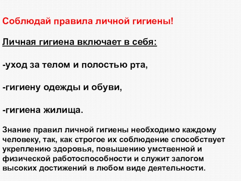 Знание правил личной гигиены необходимо каждому человеку, так, как строгое их соблюдение способствует укреплению здоровья, повышению умственной и физической работоспособности и служит залогом высоких достижений в любом виде деятельности.
