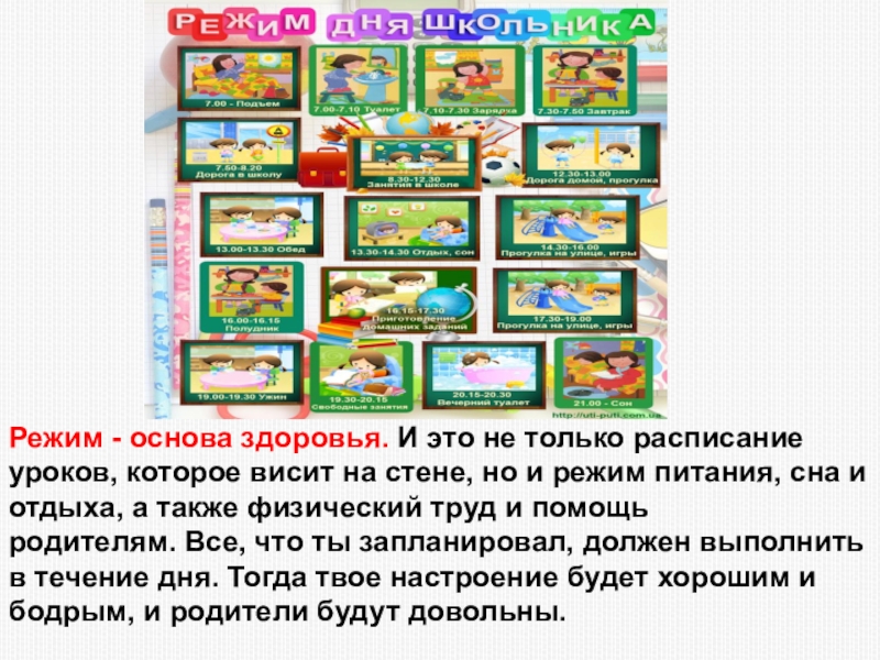 Слайд 4Режим - основа здоровья. И это не только расписание уроков, которое висит