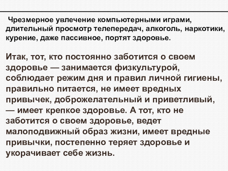 Итак, тот, кто постоянно заботится о своем здоровье — занимается физкультурой, соблюдает режим дня и правил личной гигиены, правильно питается, не имеет вредных привычек, доброжелательный и приветливый, — имеет крепкое здоровье. А тот, кто не заботится о своем здоровье, ведет малоподвижный образ жизни, имеет вредные привычки, постепенно теряет здоровье и укорачивает себе жизнь.