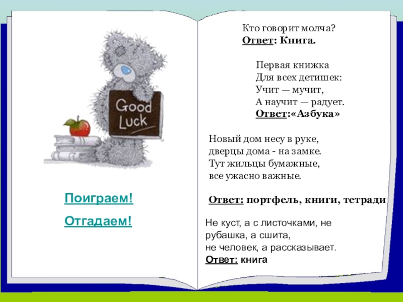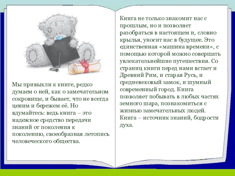 Мы привыкли к книге, редко думаем о ней, как о замечательном сокровище, и бывает, что не всегда ценим и бережем её. Но вдумайтесь: ведь книга – это надежное средство передачи знаний от поколения к поколению, своеобразная летопись человеческого общества.