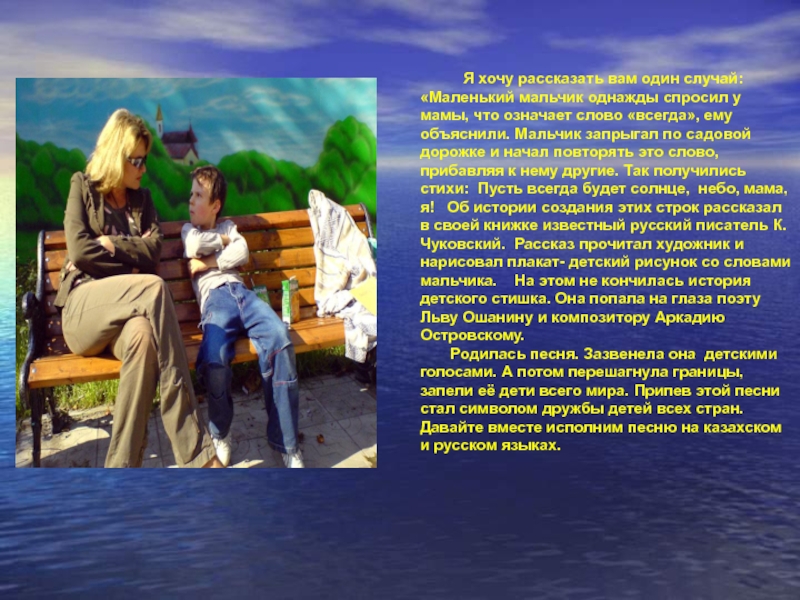 «Маленький мальчик однажды спросил у мамы, что означает слово «всегда», ему объяснили. Мальчик запрыгал по садовой дорожке и начал повторять это слово, прибавляя к нему другие. Так получились стихи:  Пусть всегда будет солнце,  небо, мама, я!   Об истории создания этих строк рассказал в своей книжке известный русский писатель К. Чуковский.  Рассказ прочитал художник и нарисовал плакат- детский рисунок со словами мальчика.    На этом не кончилась история детского стишка. Она попала на глаза поэту Льву Ошанину и композитору Аркадию Островскому.