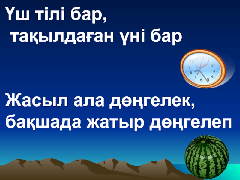 Үш тілі бар, тақылдаған үні бар Жасыл ала дөңгелек, бақшада жатыр дөңгелеп