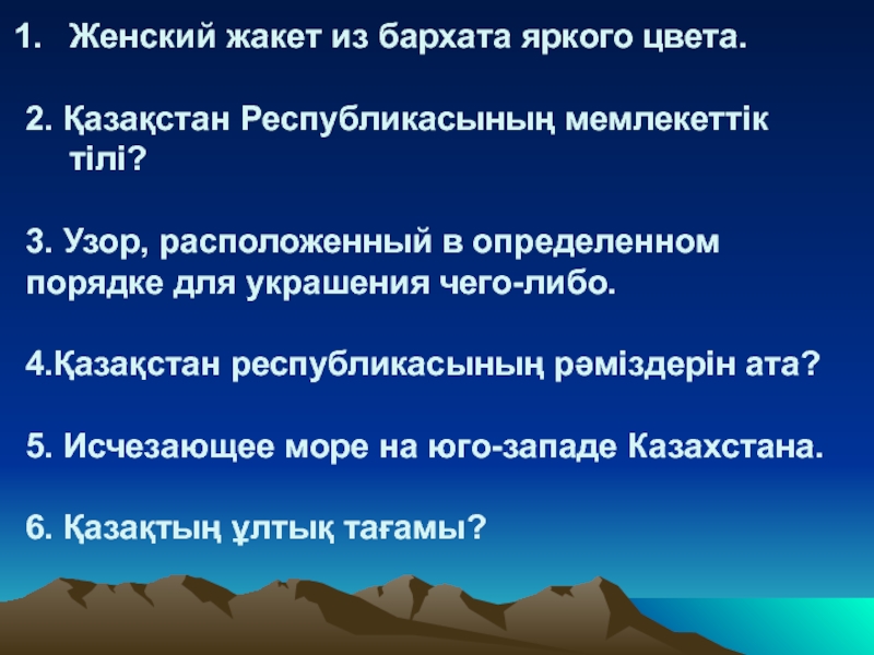 Женский жакет из бархата яркого цвета. 2. Қазақстан Республикасының мемлекеттік тілі? 3. Узор, расположенный в определенном порядке
