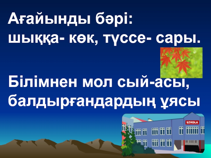 Ағайынды бәрі: шыққа- көк, түссе- сары. Білімнен мол сый-асы, балдырғандардың ұясы