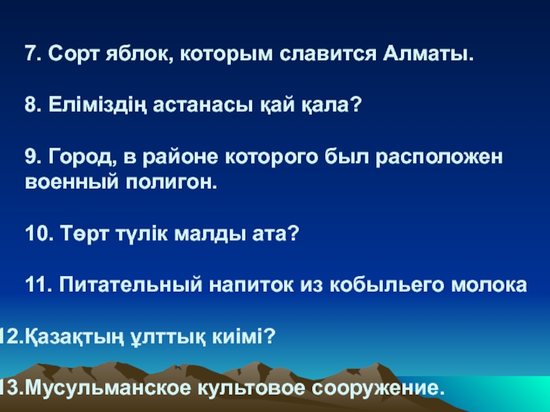 7. Сорт яблок, которым славится Алматы.  8. Еліміздің астанасы қай қала?  9. Город, в районе