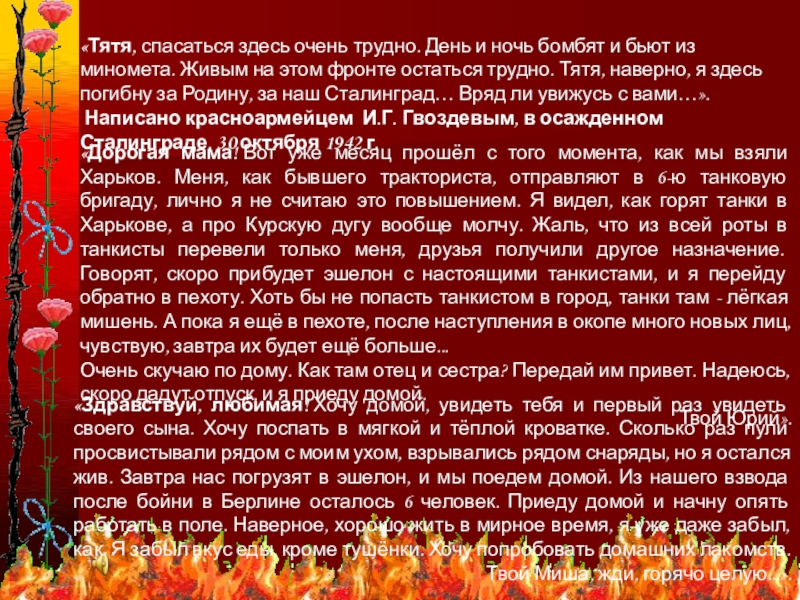 «Здравствуй, любимая! Хочу домой, увидеть тебя и первый раз увидеть своего сына. Хочу поспать в мягкой и тёплой кроватке. Сколько раз пули просвистывали рядом с моим ухом, взрывались рядом снаряды, но я остался жив. Завтра нас погрузят в эшелон, и мы поедем домой. Из нашего взвода после бойни в Берлине осталось 6 человек. Приеду домой и начну опять работать в поле. Наверное, хорошо жить в мирное время, я уже даже забыл, как. Я забыл вкус еды, кроме тушёнки. Хочу попробовать домашних лакомств.