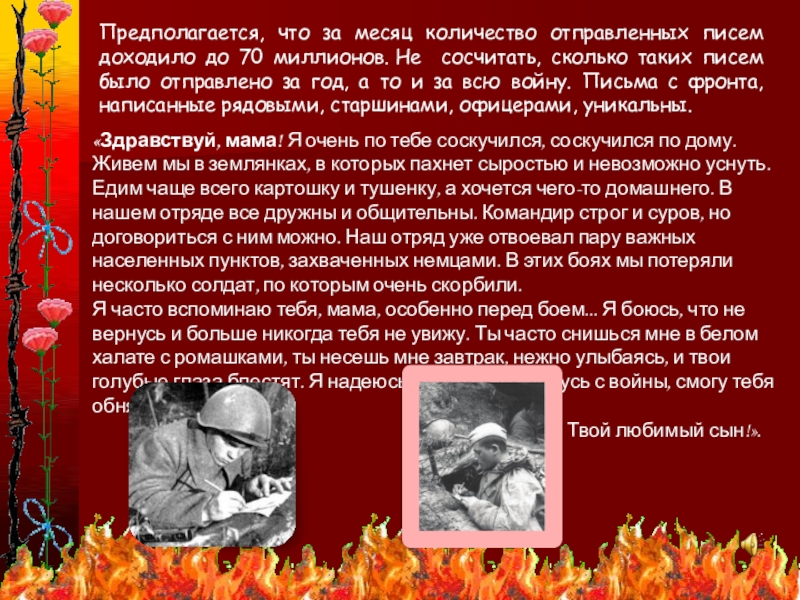 «Здравствуй, мама! Я очень по тебе соскучился, соскучился по дому. Живем мы в землянках, в которых пахнет сыростью и невозможно уснуть. Едим чаще всего картошку и тушенку, а хочется чего-то домашнего. В нашем отряде все дружны и общительны. Командир строг и суров, но договориться с ним можно. Наш отряд уже отвоевал пару важных населенных пунктов, захваченных немцами. В этих боях мы потеряли несколько солдат, по которым очень скорбили.