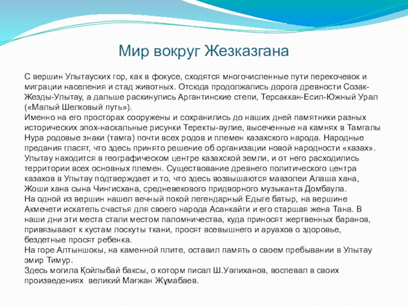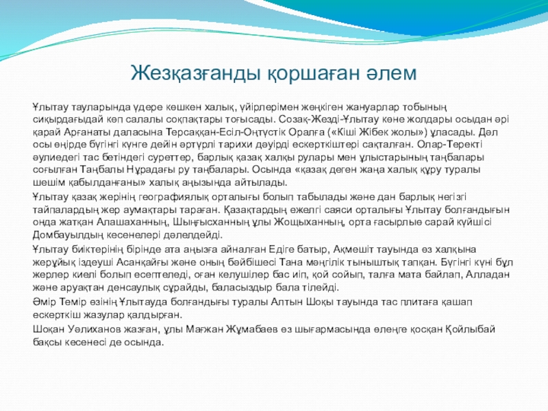 Слайд 2Қазіргі Жезқазған-еліміздің үлкен орталығы. Сонымен бірге жүз мың тұрғыны бар әдемі