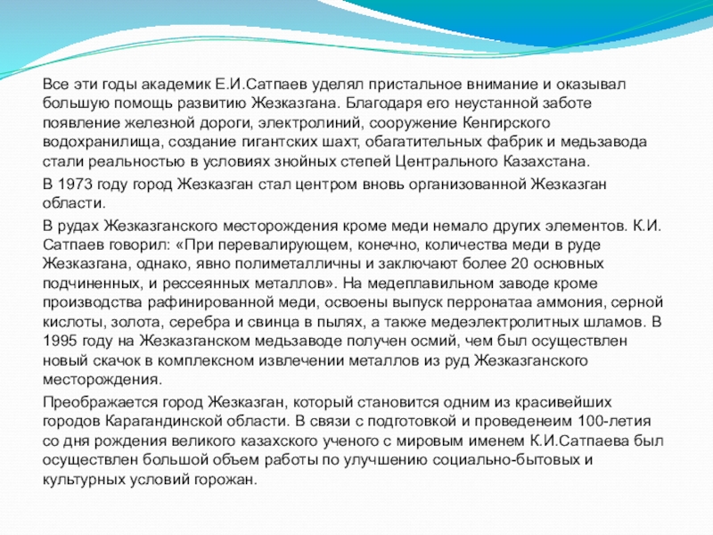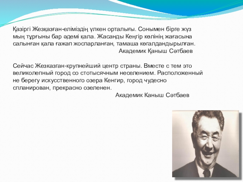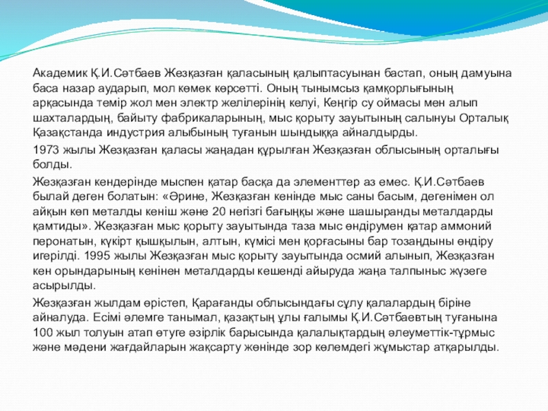 Слайд 7Академик Қ.И.Сәтбаев Жезқазған қаласының қалыптасуынан бастап, оның дамуына баса назар аударып,