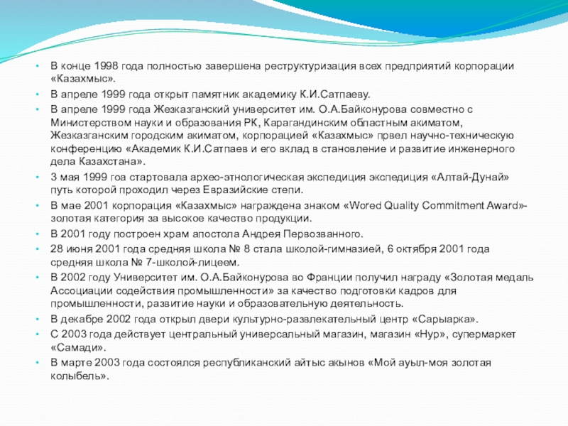 Слайд 32В конце 1998 года полностью завершена реструктуризация всех предприятий корпорации «Казахмыс».
