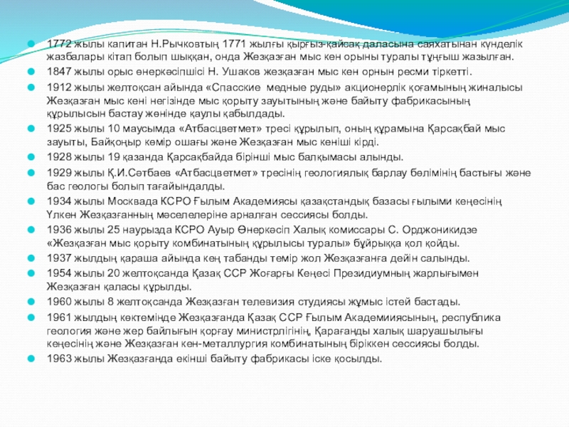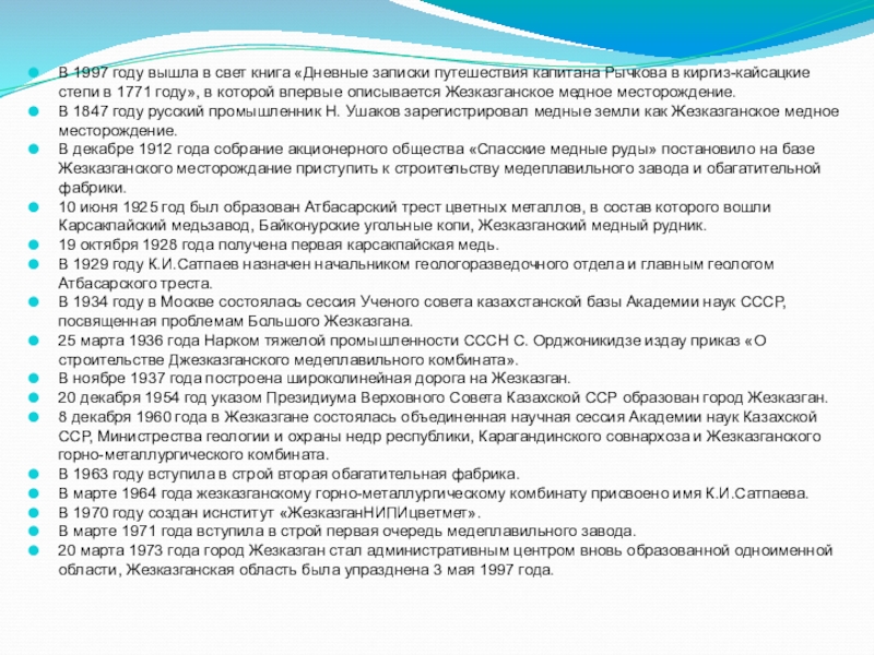 Рычкова в киргиз-кайсацкие степи в 1771 году», в которой впервые описывается Жезказганское медное месторождение.