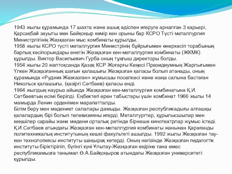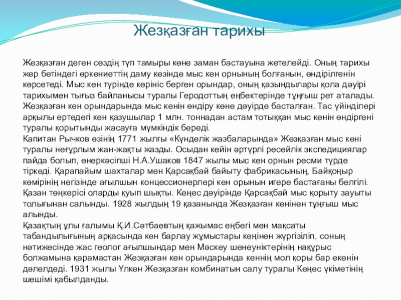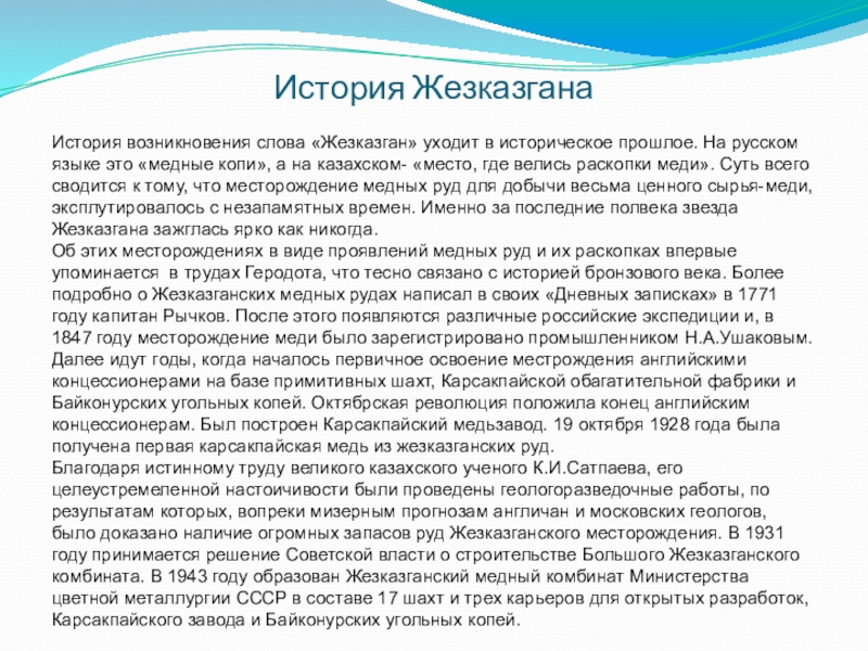 Благодаря истинному труду великого казахского ученого К.И.Сатпаева, его целеустремеленной настоичивости были проведены геологоразведочные работы, по результатам которых, вопреки мизерным прогнозам англичан и московских геологов, было доказано наличие огромных запасов руд Жезказганского месторождения. В 1931 году принимается решение Советской власти о строительстве Большого Жезказганского комбината. В 1943 году образован Жезказганский медный комбинат Министерства цветной металлургии СССР в составе 17 шахт и трех карьеров для открытых разработок, Карсакпайского завода и Байконурских угольных копей.