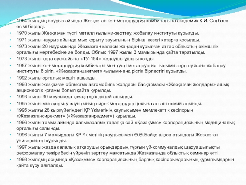 Слайд 281964 жылдың наурыз айында Жезқазған кен-металлургия комбинатына академик Қ.И. Сәтбаев есімі