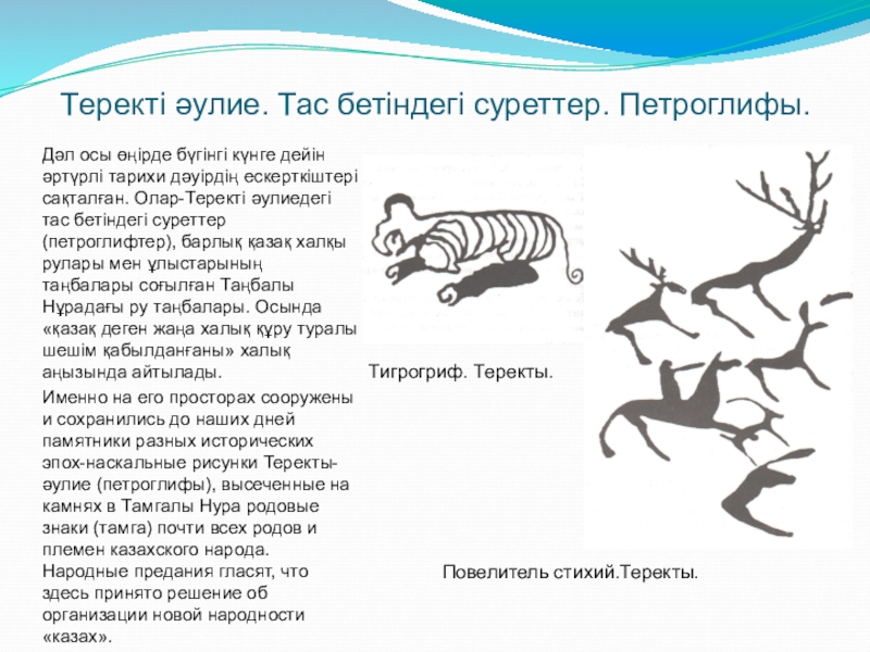Слайд 26Теректі әулие. Тас бетіндегі суреттер. Петроглифы.