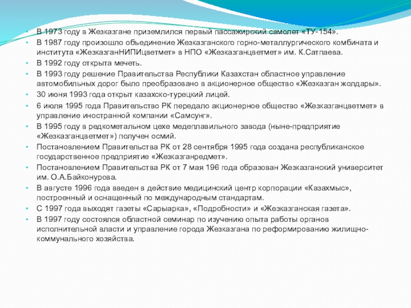 Слайд 31В 1973 году в Жезказгане приземлился первый пассажирский самолет «ТУ-154».