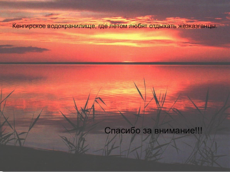 Сейчас Жезказган-крупнейший центр страны. Вместе с тем это великолепный город со стотысячным неселением. Расположенный не берегу искусственного озера Кенгир, город чудесно спланирован, прекрасно озеленен.